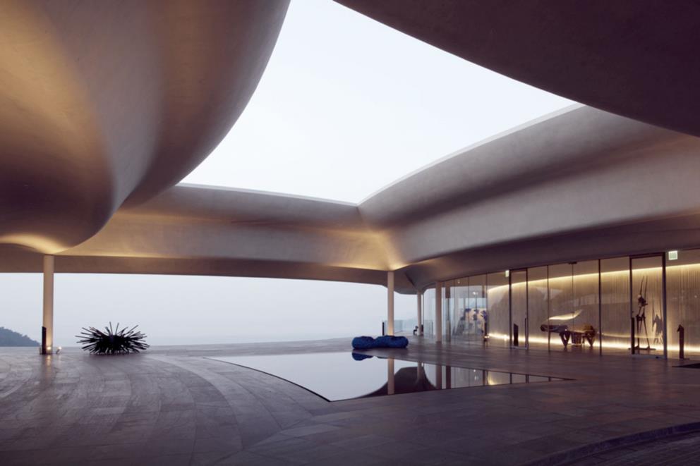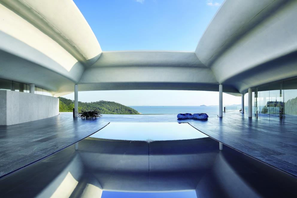 South Cape Spa and Suites is a resort complex facing the South Sea on the Korean Peninsula, where you can also enjoy playing golf. This luxury resort, which is open to the sea, offers guests the ultimate in relaxation. The concrete walls undulate like waves along the building, creating a dynamic appearance that makes it seem to float in the sky. Guest rooms are furnished with DUX beds and Ligne Roset furnishings, and you can enjoy a Geneva sound system. In addition, the rooms feature Aesop amenities. Don't miss the rare pianos and artwork scattered throughout the building.
