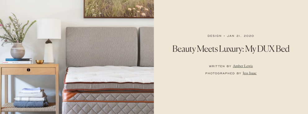 لحسن حظي (ولك الآن!) عثرت بالصدفة على العلامة التجارية السويدية DUX، وأعجبني للغاية سرير DUX الذي تقدمه تلك العلامة. DUX علامة تجارية شهيرة في السويد توفر منتجاتها هنا من خلال متاجر DUXIANA في الولايات المتحدة، وقد أقبلت على شراء أحد أسرتهم على الفور بعد مشاهدتي له بنفسي.