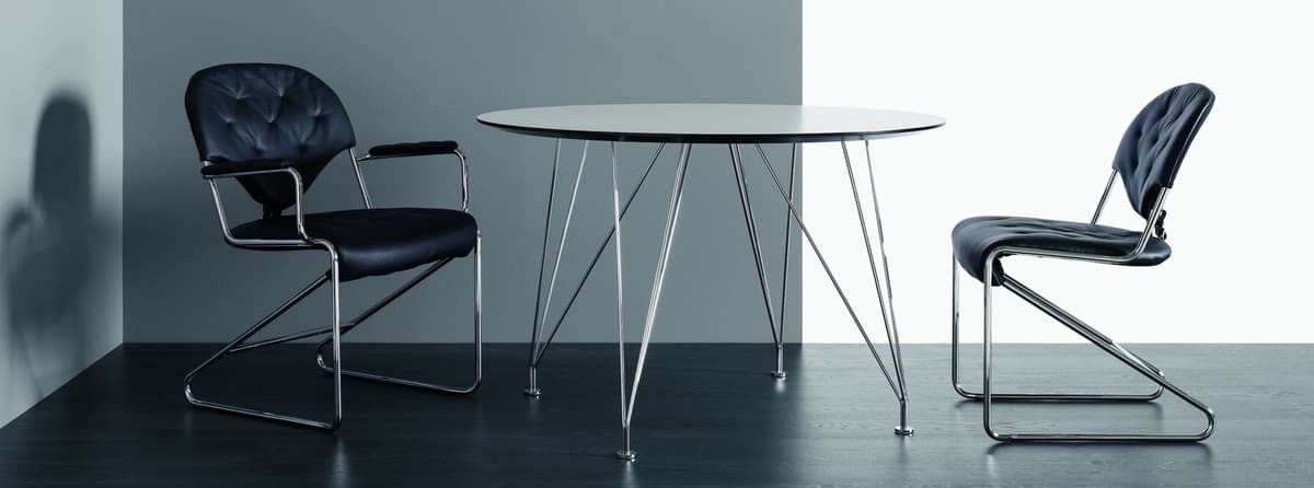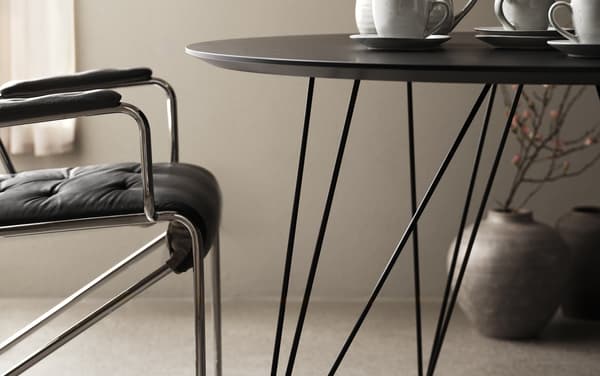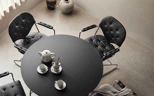 طاولة مقهى دائرية تشجع على تبادل الحديث والتواصل البصري مع جميع الضيوف. تتوفر كذلك بتصميم طاولة طعام أو طاولة طعام بقسمين قابلين للتمديد.