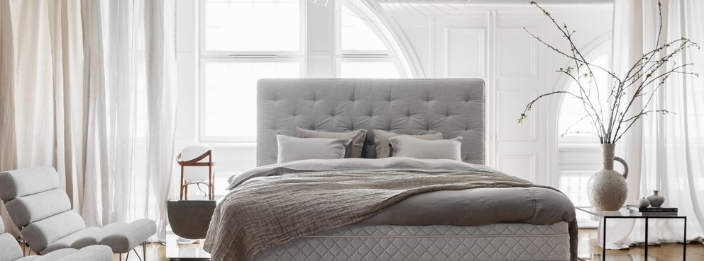 DUX Royal is a series of complementary bed accessories, such as bed skirts and decorative cushions. The design was developed in collaboration with the legendary Hotel d’Angleterre in Copenhagen. A headboard with comfortable, supportive padding. The clean design is based on traditional deep tufting and is also available with or without buttons.