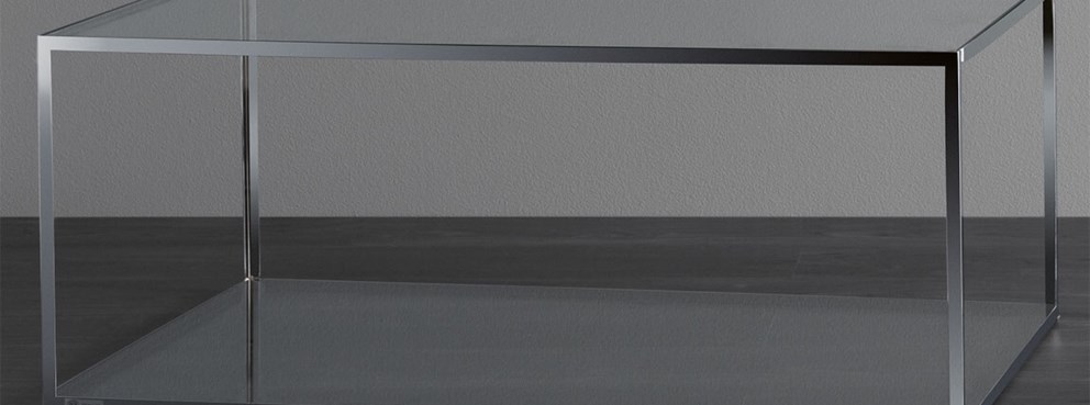 A classic table with a rectangular shape in chrome or black metal, with a glass top and bottom.